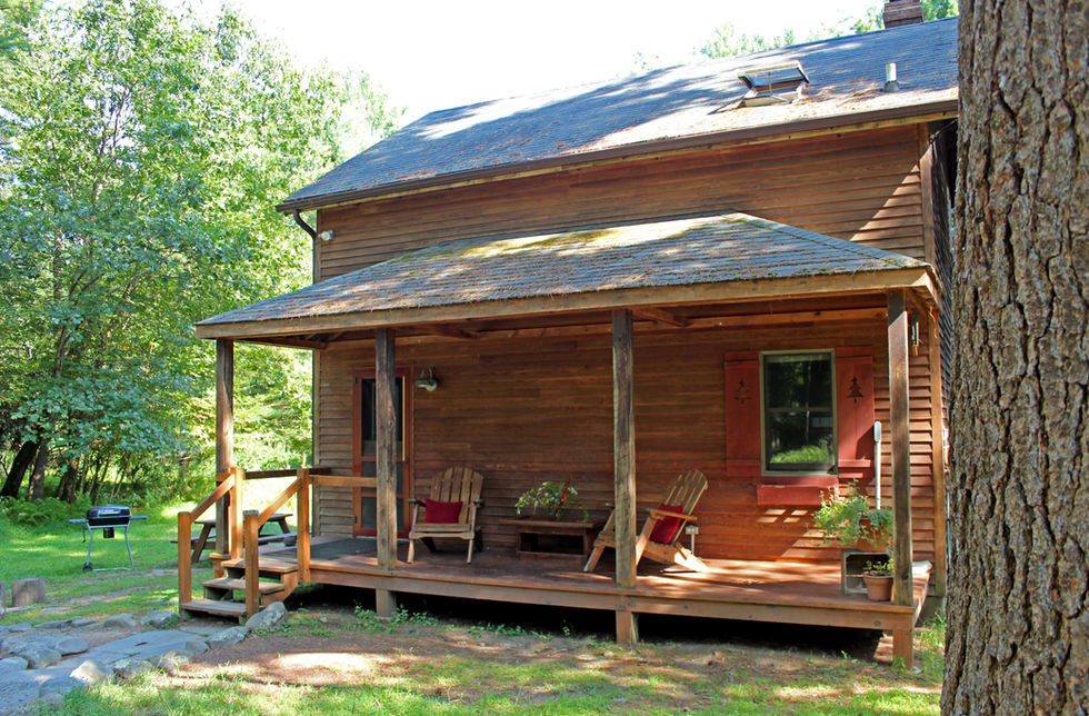 The Hermitage is a 950 square foot two bedroom year round cabin. Entering from the covered front porch there is one open room serving as the kitchen, living and dining space. Beamed ceiling, wood floors and stone fireplace gives the cabin warmth and character. Glass sliding door leads to a spacious screened porch with table, benches and hot tub. Off the porch a large private deck. The kitchen is fully equipped. Upstairs there are two bedrooms with queen size beds and one full size bath. The Hermitage is air-conditioned and there is a TV and DVD player. Firewood for the fireplace is supplied for the daily rate. There is a large yard with a picnic table, lounge chairs, charcoal grill and fire pit. The Mast Hope Brook is our private trout stream and only a few hundred feet away. Step out to miles of nature trails for hiking or snow-shoeing. The Delaware River and our private access is a 15 minute walk. The river can be a delight for swimming and fishing. We have a couple of canoes for your use in the river's eddy.